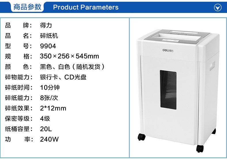 商品名称:得力/deli 9904 碎纸机 4级保密/20L/白色