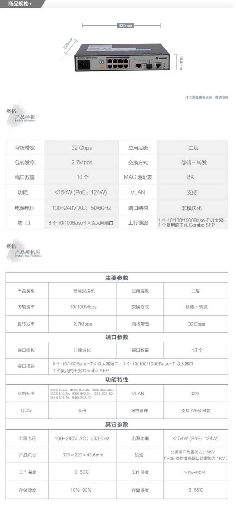 商品名称:华为 HUAWEI S2700-9TP-PWR-EI以太网智能8口百兆接入交换设备POE供电二层应用新一代绿色节能